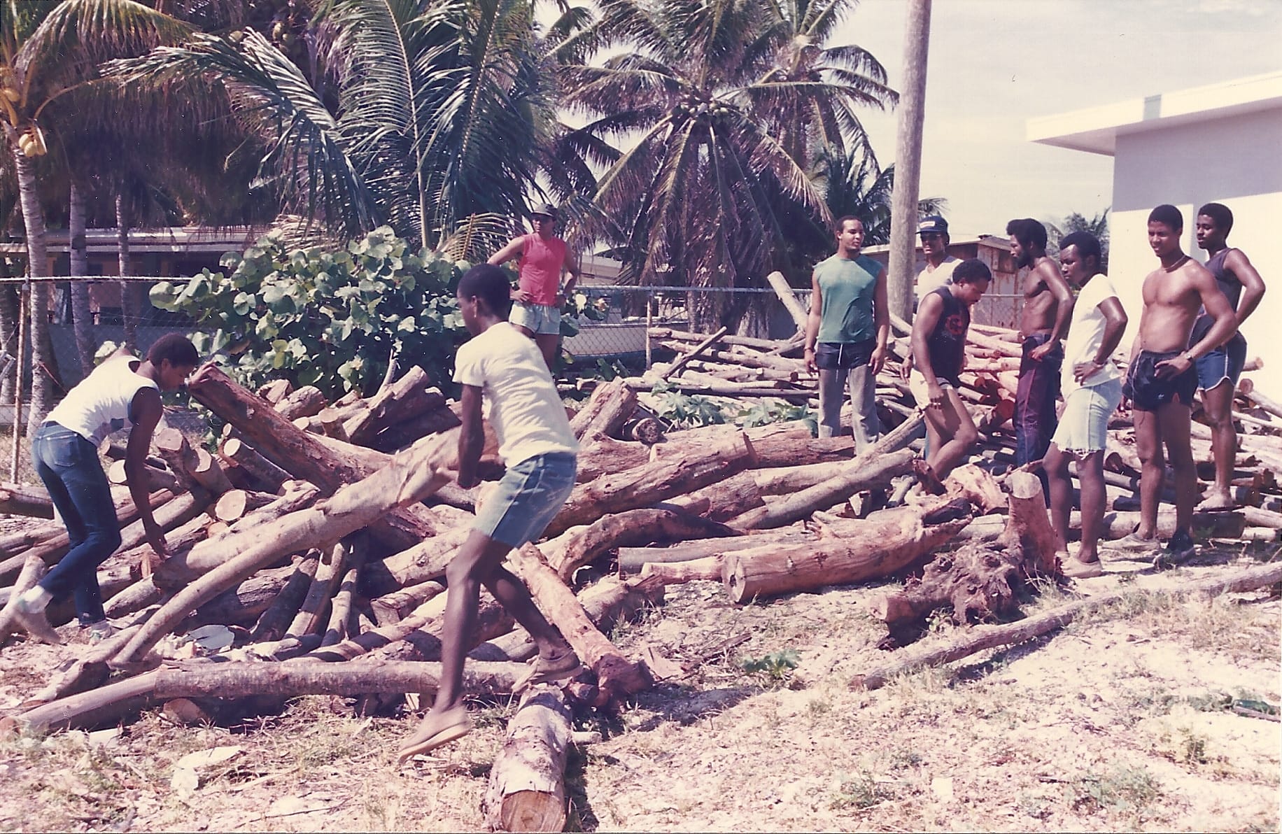 A photograph of two men standing on a small motorboat, laying some of the last tree logs for a large bonfire near the reef in East End, sparks childhood memories for Graham Rankin of a decades-long tradition.